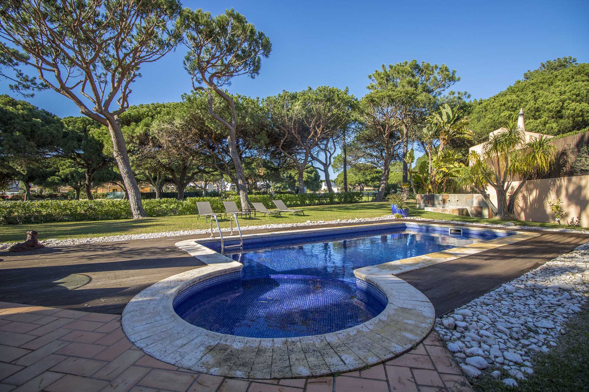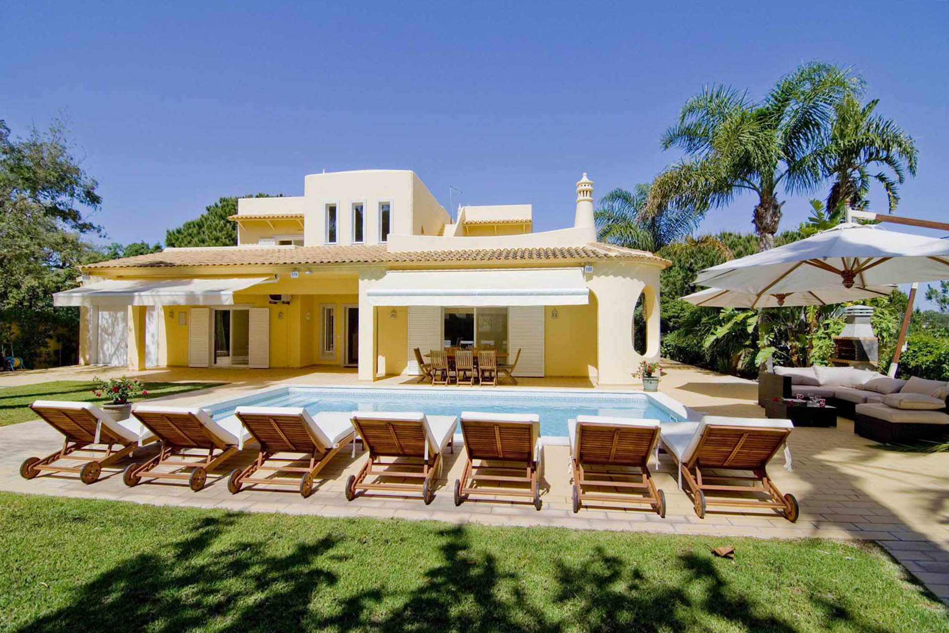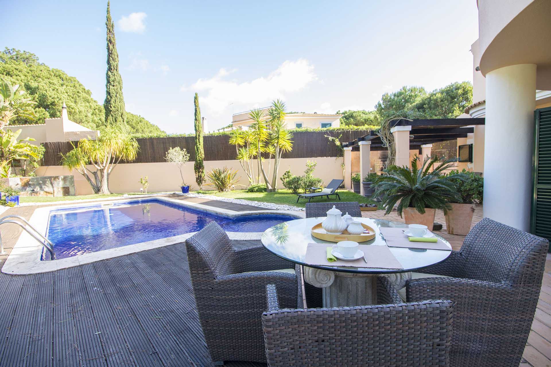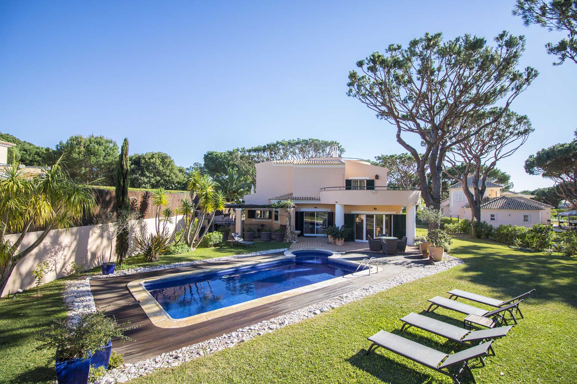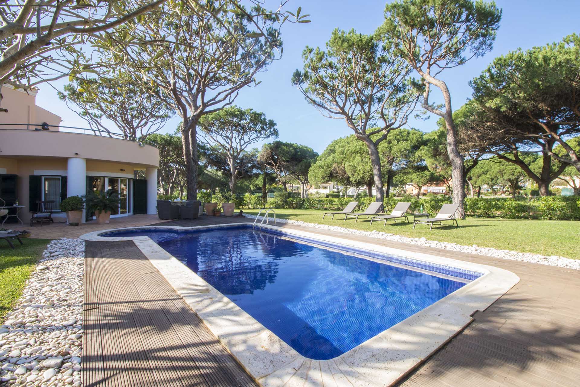 Private villa with 6 bedrooms and 7 bathrooms, located in a quiet cul-de-sac with no passing cars. This villa is just in front of the Pinhal Golf Course, has a refreshing swimming pool and a good-sized garden. It has a lovely outdoor area, in particular the barbecue and outdoor dining areas.