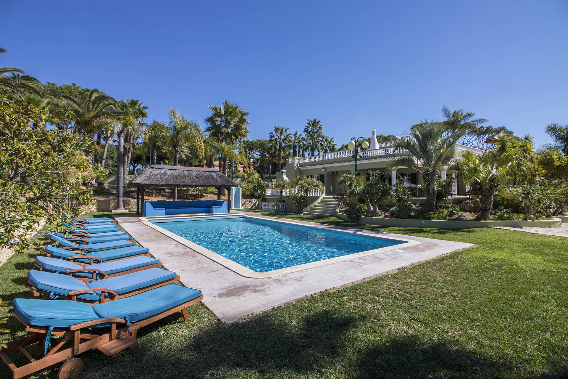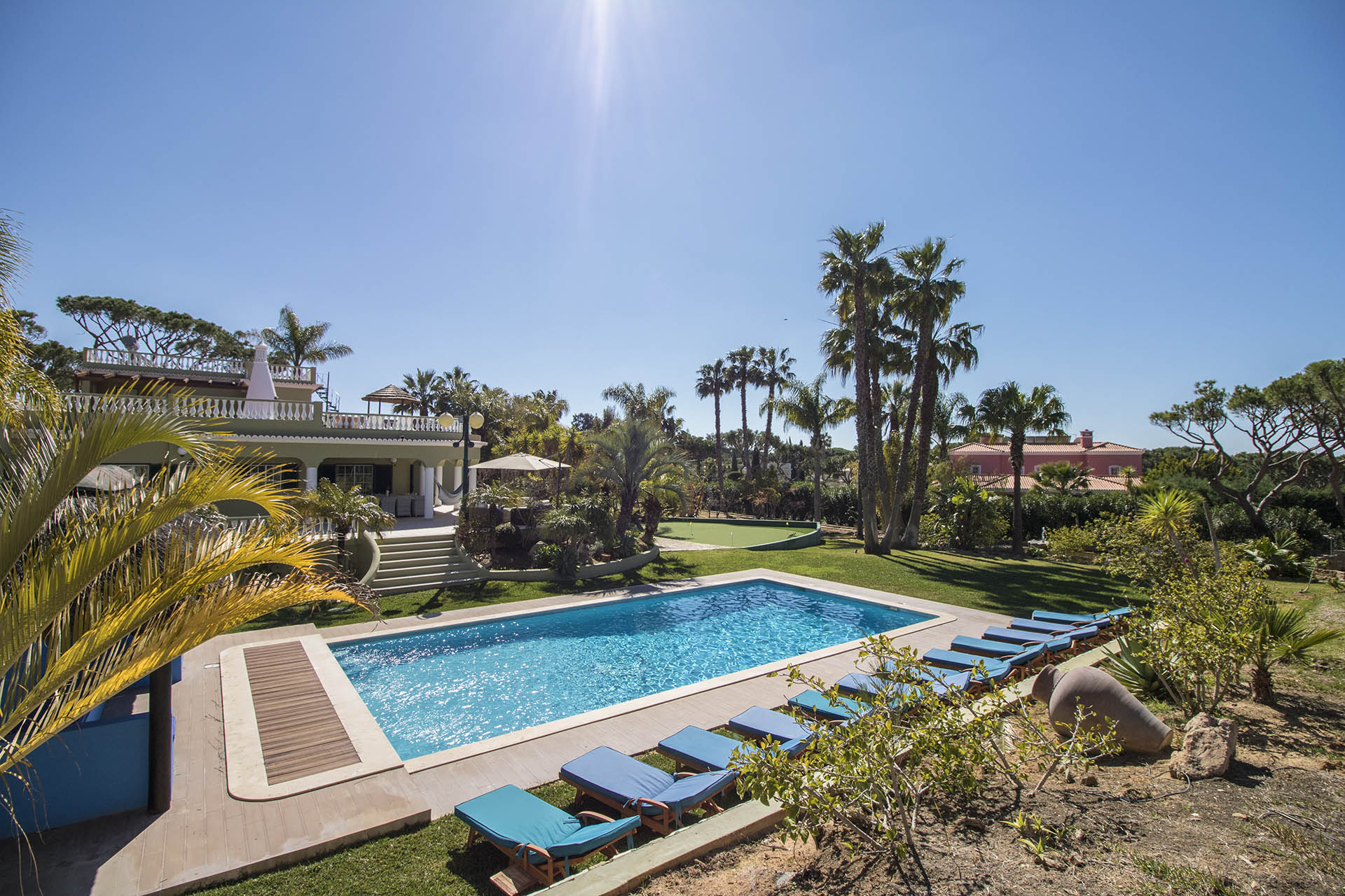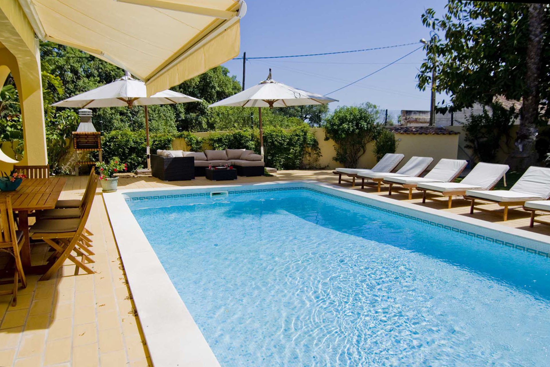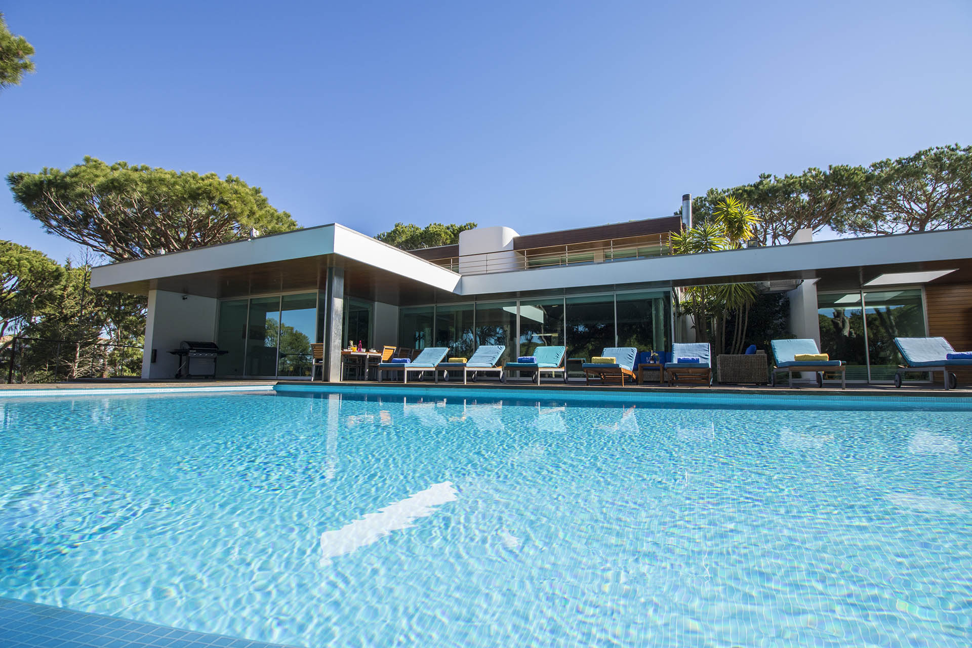 Private villa with 6 bedrooms and 7 bathrooms, located in a quiet cul-de-sac with no passing cars. This villa is just in front of the Pinhal Golf Course, has a refreshing swimming pool and a good-sized garden. It has a lovely outdoor area, in particular the barbecue and outdoor dining areas.