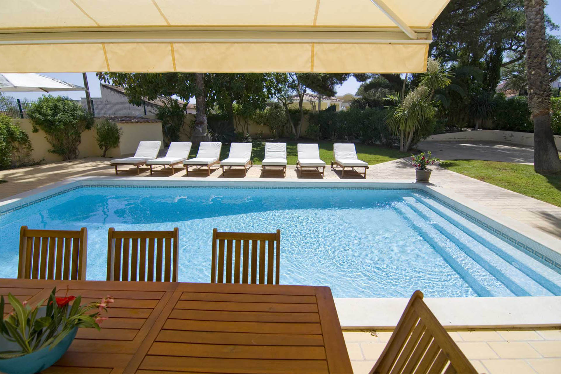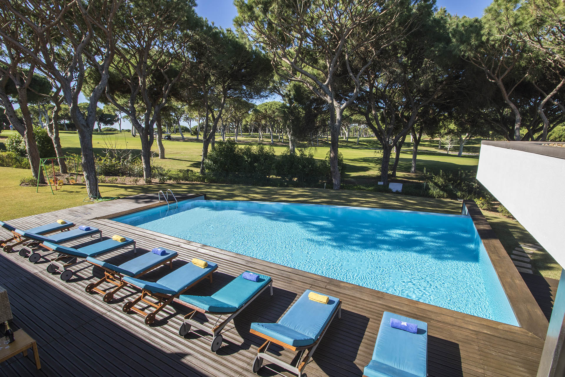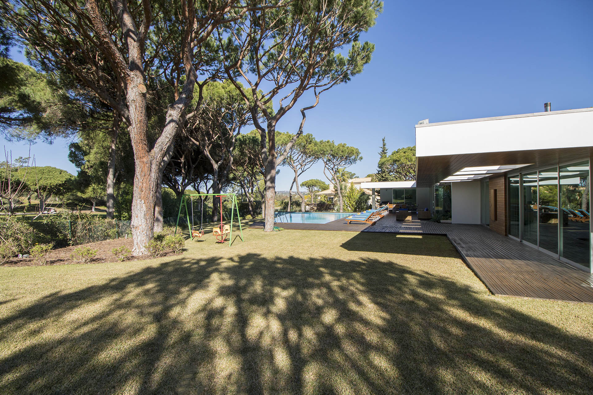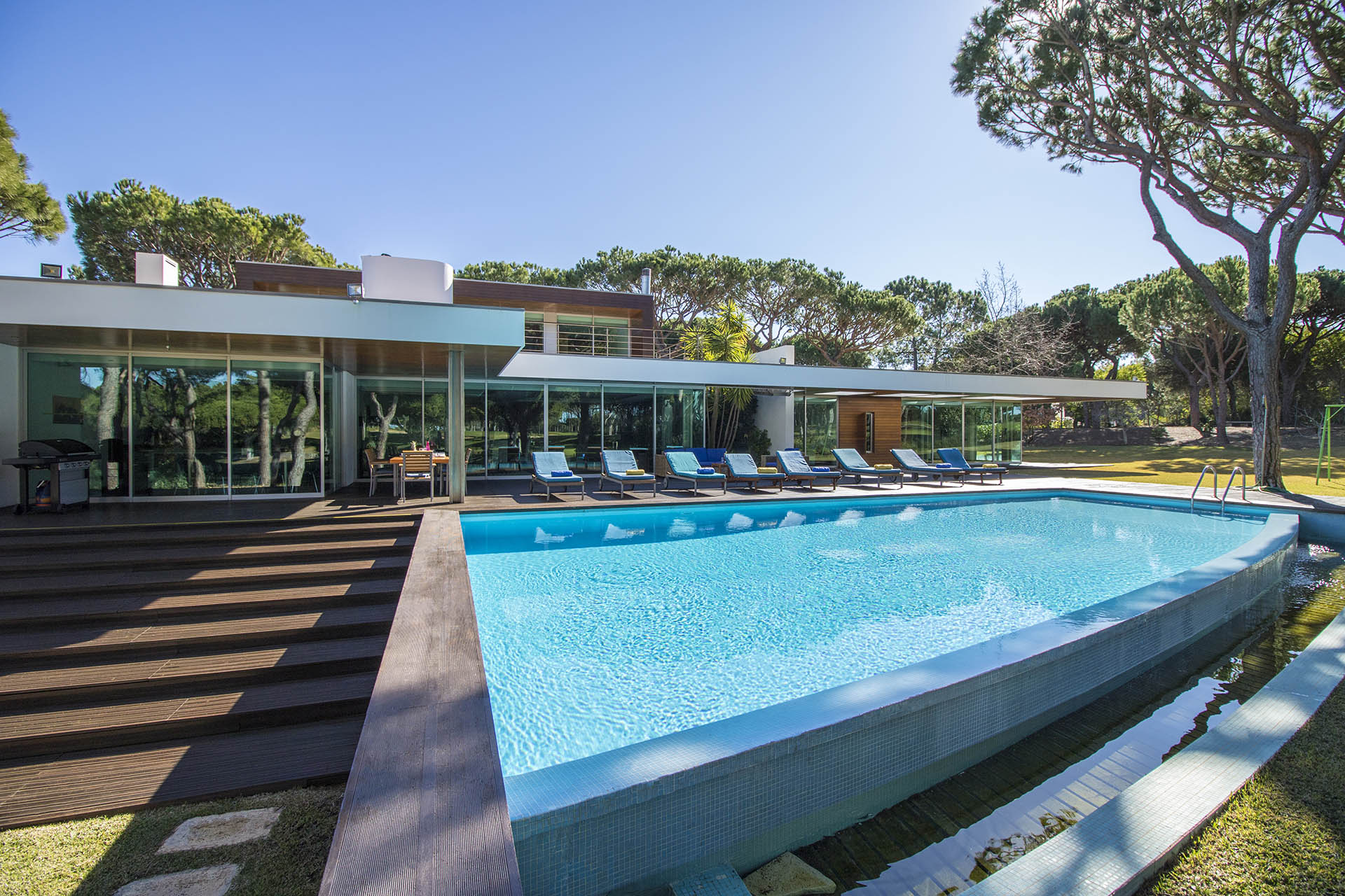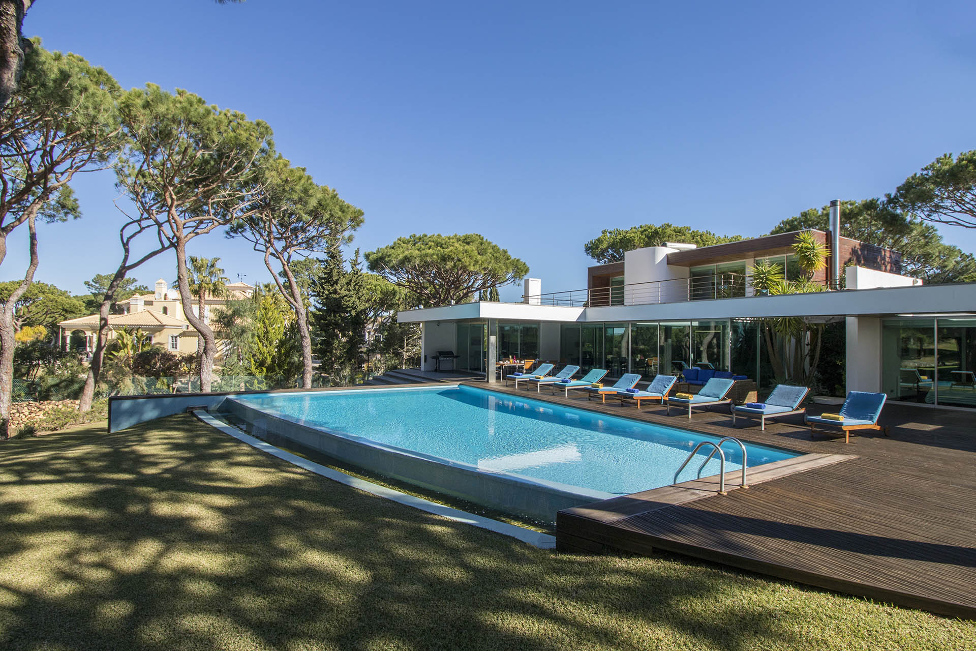 Private villa with 6 bedrooms and 7 bathrooms, located in a quiet cul-de-sac with no passing cars. This villa is just in front of the Pinhal Golf Course, has a refreshing swimming pool and a good-sized garden. It has a lovely outdoor area, in particular the barbecue and outdoor dining areas.